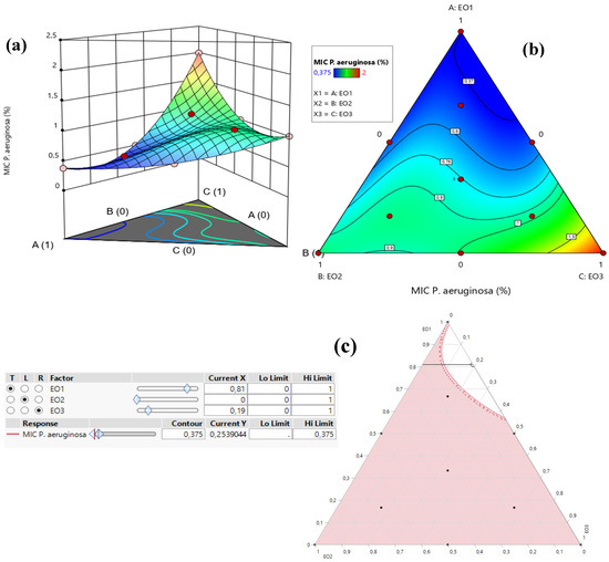 The optimal MIC value for P. aeruginosa was determined through an analysis of 2D and 3D mixture plots focused on the identified compromise region. Panels (a,b) depict 3D mixture plots, highlighting the desired compromise zone within the binary mixing area of T. satureioides and O. majorana. Panel (c) presents a 2D mixture plot that identifies the optimal compromise region, achieving the target MIC value of 0.25% against P. aeruginosa. This result was attained with a binary mixture comprising 81% T. satureioides and 19% O. majorana essential oils. EO1: T. satureioides EO; EO2: L. angustifolia EO; EO3: O. majorana EO.