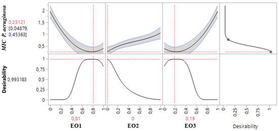 Additionally, the desirability function analysis (Figure 9) provides further insights, suggesting a 99.31% probability of achieving an optimal MIC value of 0.25% by utilizing a binary mixture primarily composed of 81% TSEO and 19% OMEO. These results underscore the importance of precise ratio optimization in enhancing the antibacterial potency of essential oil mixtures, providing a practical framework for achieving superior outcomes against P. aeruginosa.