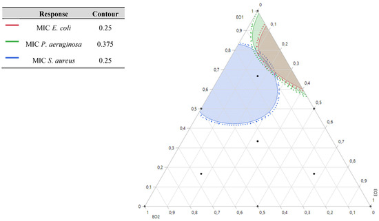 Table 3 provides a detailed examination of the antibacterial effectiveness of various combinations of EOs from T. satureioides, L. angustifolia, and O. majorana against three bacterial strains: E. coli, S. aureus, and P. aeruginosa. This study employs a simplex–centroid design to evaluate the synergistic effects of these oils, with effectiveness quantified by the minimum inhibitory concentration (MIC).