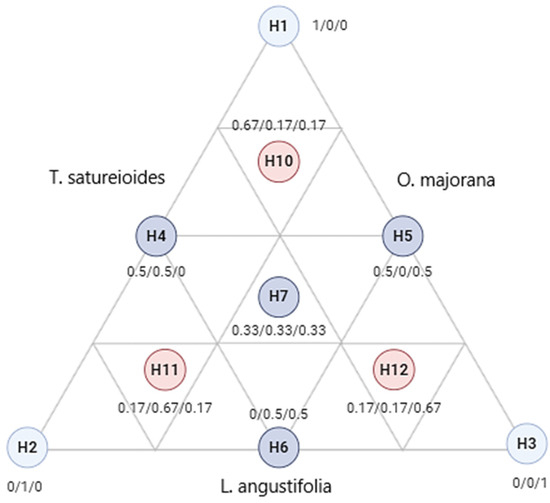 Research has shown that combining EOs can yield synergistic effects, enhancing efficacy against pathogens more effectively than single applications. However, most studies have focused on simple binary or ternary EO mixtures without optimization. The simplex–centroid-mixture design allows researchers to model and predict the behavior of mixture components and their interactions using a minimal number of experimental runs while maintaining high accuracy [33,34]. Unlike traditional one-factor-at-a-time approaches, simplex–centroid designs can efficiently explore the entire mixture space and identify optimal blend proportions, making them particularly valuable for studying EO combinations [35].