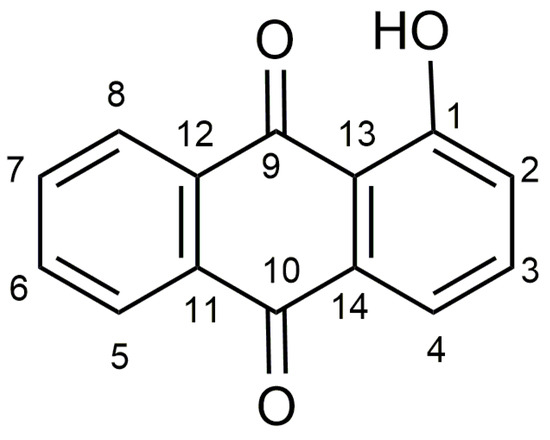 Anthraquinone derivatives have broad therapeutic applications [8], particularly noted for their antitumor activity against various types of cancer [9,10,11], including melanoma [12,13,14,15]. The 1-hydroxy-9,10-anthraquinone HQ (Figure 1) is derived from the basic structure of 9,10-anthracenedione and includes a hydroxyl group, enabling it to coordinate with several metallic cations [16].