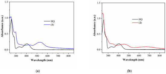 Figure 2. UV–vis absorption spectra in CH2Cl2 of (a) HQ 2.65 × 10−5 mol L−1 and (1) 1.27 × 10−5 mol L−1, and (b) HQ 2.65 × 10−5 mol L−1 and (2) 1.63 × 10−5 mol L−1.