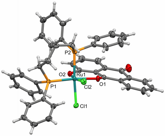 As expected, the HQ ligand replaced the water ligand and one of the chloride ligands cis to the dppb phosphorous atom in the precursor (P2) (Figure 6). The structural superposition of (2) and its precursor [27] highlights their intramolecular geometric similarities, considering the dppb and chlorine moieties (Figure 6). The stereochemistry and coordination sphere of (2) are very similar to the analogous structures containing Ru(III) complexes with hydroxybenzophenones with the general formula cis-[RuCl2(HB)(dppb)], obtained from the same precursor [32].