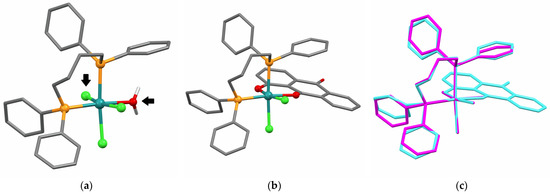 Figure 6. Capped sticks representations of (a) the precursor (P2) [27]; (b) the complex (2) structures highlighting the coordination replacement positions; and (c) the molecular superposition, matched by the homologous phosphorus and chloride atoms in the coordination sphere using the Mercury structure overlay calculation.