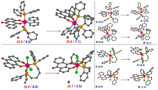 Figure 8. Comparison of relative Gibbs free energy (in kcal mol−1 at 298.15K and 1 atm; gas phase values in red and solvent values in blue) between the trans-(A) and cis-(B) arrangement of PPh3 ligands in (1) (top right) and the cis-(A) and trans-(B) configuration of chlorine atoms in (2) (bottom right). On the left side, the relative Gibbs free energy in solvent is shown for different HQ coordination modes (A′ and B′) corresponding to each configuration of the ruthenium–HQ complexes. Hydrogen atoms in the structures were omitted for clarity.