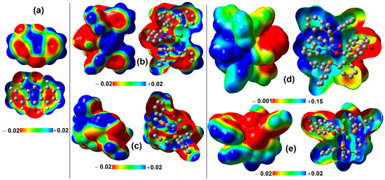 Figure 9. The molecular electrostatic potential (with an isovalue of 0.001 a.u.) of (a) HQ; (b) (P1); (c) (P2); (d) (1); and (e) (2). In these maps, regions in blue and red indicate positive and negative potentials, respectively. Each item includes a front view of the solid surface, and a bottom side view revealing the back of the surface and displaying the molecular disposition. Hydrogen atoms in the ruthenium structures were omitted for clarity.