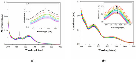 The UV–vis spectra obtained for (1) after increasing additions of ct-DNA (Figure 10a) demonstrated hypochromism and a shift of the bands to the red region of the spectrum (bathochromism). This effect is characteristic of the intercalative interaction mode of the complex with DNA [51,52,53,54,55], and similar behavior has been observed in other studies with complexes containing anthraquinone derivative ligands [56,57].