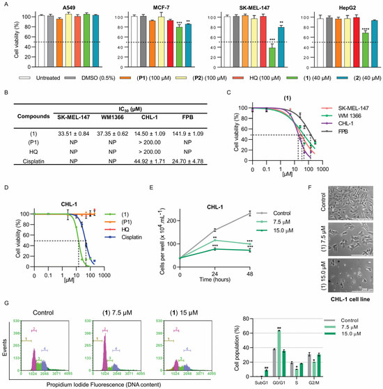 Figure 11. Compound (1) is cytotoxic to melanoma cells. (A) Screening data showing that melanoma cell SK-MEL-147 was more responsive to treatment with (1) than HepG2, A549, and MCF-7. The cells were treated with (1) at 40 µM for 48 h. (B) IC50 values (µM) were determined from dose–response curves obtained by MTS assay. Melanoma cells (SK-MEL-147, WM1366, and CHL-1), and FPB (dermal primary fibroblast) were treated with (1) or its precursors (P1) and HQ for 48 h. Cisplatin was used as a positive control. NP: not performed. (C,D) Dose–response curves determined by MTS. (E) Cell growth kinetics from 0 to 48 h were determined by counting viable cells in the presence of Trypan Blue. (F) Contrast microscopy images showing the morphological characteristics of CHL-1 cells treated with 7.5 and 15 µM of (1) for 24 h. The scale bar indicates 200 µm. (G) Representative histograms obtained from cell cycle analysis using flow cytometry. CHL-1 cells were treated for 24 h with (1) at 7.5 or 15 µM. Sub-G1 (brown, 1), G0/G1 (pink, 2), S (green, 3), G2/M (blue, 4). **** p < 0.0001, *** p < 0.001, ** p < 0.01, and * p < 0.05 compared to the control group, according to one-way analysis of variance (ANOVA) followed by Dunnett’s post-test.