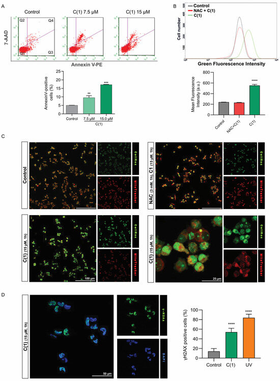 Figure 12. Compound (1) induces apoptosis via ROS generation in the CHL-1 cell line. (A) Representative dot plot graphs obtained from the Annexin V/7AAD analysis using flow cytometry. Q1, viable cells; Q2 necrotic cells; Q3, early apoptosis; Q4, late apoptosis. (B,C) Measurement of reactive oxygen species (ROS) levels by CellRox Green reagent using flow cytometry and confocal microscopy, respectively. CHL-1 cell was treated with (1) for 1 h. Representative histogram shows the control group (DMSO, black line), cells pre-treated with NAC (1 h) and exposed to (1) at 15 µM (red line), and cells treated with (1) at 15 µM (green line). (D) Illustrative fluorescence images obtained by confocal microscopy and phospho-H2AX (γ-H2AX) quantification, a DNA damage marker. The CHL-1 cell line was treated with (1) at 15 μM for 1h. Nuclei were stained with DAPI. Cells irradiated with ultraviolet C light for 20 min were used as positive controls. **** p < 0.0001, *** p < 0.001, and ** p < 0.01 vs. control group, according to ANOVA followed by Dunnett’s post-test.