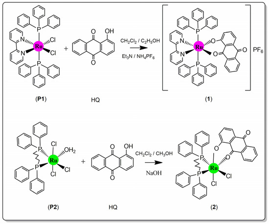 Solvents were purified by standard methods, and all manipulations involving solutions were performed under an argon atmosphere using a Schlenk line. All chemicals used were of reagent grade or comparable purity. RuCl3∙xH2O and ligands 1-hydroxy-9,10- anthraquinone, 2,2′-bipyridine, triphenylphospine, and 1,4-bis(diphenylphosphino)butane were used as received from Sigma-Aldrich™. The precursors (P1) and (P2) were synthesized following the procedures outlined in the literature references [26,27], respectively.