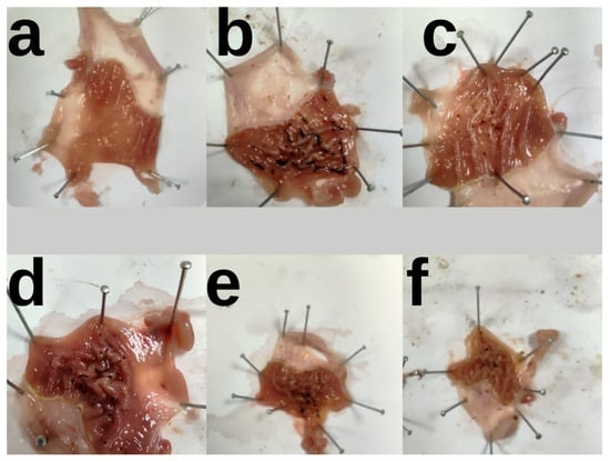 Results of gastric macroscopic pictures. (a), intact group; (b), indomethacin group; (c), reference group (40 mg/kg of famotidine); (d–f), treatment groups (100, 200 and 400 mg/kg b.w. of M. neglectum, respectively).