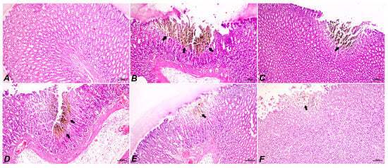 Results of gastric morphology and H&E staining. Results of gastric H&E staining section 100 µm. (A), intact group; (B), indomethacin group; (C), reference group (40 mg/kg of famotidine); (D–F), treatment groups (100, 200 and 400 mg/kg b.w. of M. neglectum, respectively). Necrotic area (arrows). Scale bar: 100 µm.