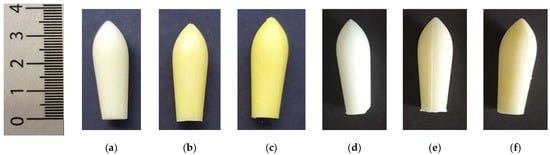 The model suppositories were torpedo-shaped, smooth in texture, and free of entrapped air, contraction holes, and brittle fracture. Upon visual examination with the naked eye and a hand lens, the external and internal surfaces of the suppositories displayed uniformity in appearance. This uniformity was observed in terms of color and texture. All prepared suppositories had a shiny, smooth surface, torpedo shape, and smooth texture, without trapped air. The appearances of the suppositories prepared from cocoa oleum and Witepsol® H15 with MCT oil and with Cannabis extractum normatum on an MCT oil base are shown in Figure 1a–c and Figure 1d–f, respectively.