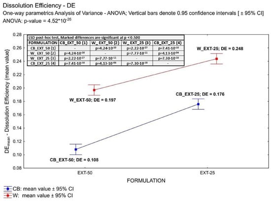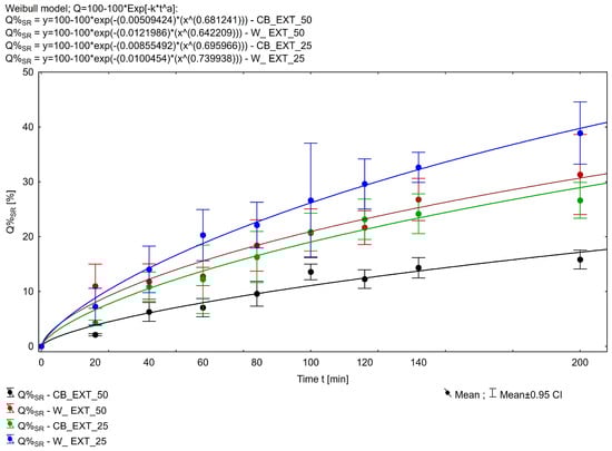 The phytocannabinoids (THC and CBD) are categorized as Biopharmaceutics Classification System class II drugs with high lipophilicity (logP of ~6.3 and ~6.97, respectively), low water solubility (12.6 and 28.0 mg/L, respectively), and a pKa of 9.29 and 10.6, respectively []. To evaluate the release of ∆-9-THC, CBD, and CBN from the suppositories, the phosphate buffer (pH = 7.4) with the addition of 2.0% sodium lauryl sulfate was used. The release of THC from Witepsol® H15-based suppositories was more efficient than from those based on cocoa butter; more than 38% of the drug released within 200 min from the W_EXT_25 formulation, while more than 26% of THC was released in this time from the CB_EXT_25 formulation. The release of THC from batches W_EXT_50 and CB_EXT_50 containing 50 mg of THC was lower and resulted in >31% and >15% released, respectively. Figure 2 shows the release profile of THC from the prepared fatty suppository bases. Dissolution efficiency (DE), the area under a dissolution curve between defined time points, was compared for the characterization of dissolution profiles. Determined for the four compared formulations, the mean values of the THC dissolution efficiency (Equations (1)–(3)) were compared with each other using parametric one-way ANOVA. The LSD post hoc test was used for multiple comparisons of each type. The normality of the distributions of the compared variables was assessed with the W Shapiro–Wilk test, and the homogeneity of variance, with Levene’s and Brown–Forsythe tests. The analyzed variables met the criterion of normality and homogeneity of variance. The significance level employed in all statistical analyses was α = 0.05. Dissolution efficiency (DE) is define as in Equation (1):