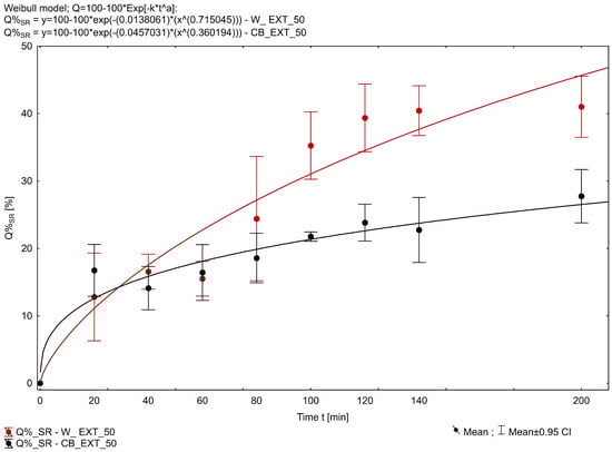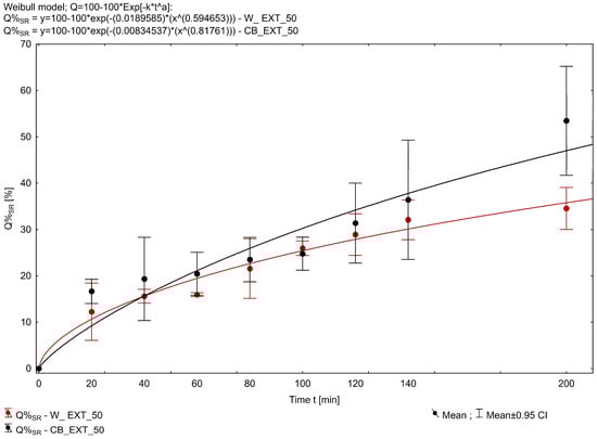 The empirical parameter DE was found highest for the Witepsol-based formulations (Figure 3), and the DE values for W_EXT-50 and CB_EXT-50 were 0.197 and 0.108, respectively. In contrast, for the W_EXT-25 and CB_EXT-25 formulations, the DE values were 0.248 and 0.176, respectively. The cumulative amounts of CBD and CBN released from the suppository formulation containing 0.6 g of Cannabis extractum normatum (50 mg of THC/suppository) versus the time are presented in Figure 4 and Figure 5. More than 50% of the loaded CBD was released from the CB_EXT_0.5 formulation in the first 200 min, while less than 35% of CBD was released from the W_EXT_0.5 formulation at the same time. In the case of CBN analysis, more than 40% of the loaded substrate was released from the W_EXT_50 formulation within the first 200 min, while less than 30% was released from the CB_EXT_50 formulation, respectively, within the same period time.
