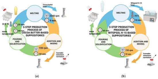 Scheme of technology preparation of suppositories with Cannabis extractum normatum on fatty bases: (a) cocoa butter; (b) Witepsol® H15. Created with Biorender.com.
