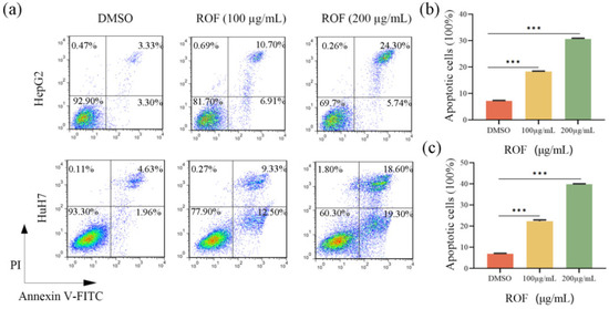 Apoptosis-inducing effect of ROF on HepG2 and HuH7 cells. (a) Annexin-V-FITC/PI double-staining assay was used to analyze cell apoptosis by flow cytometry. (b) Histogram of apoptosis statistics of HepG2 cells. (c) Histogram of apoptosis statistics of HuH7 cells. (n = 3, *** p < 0.001).