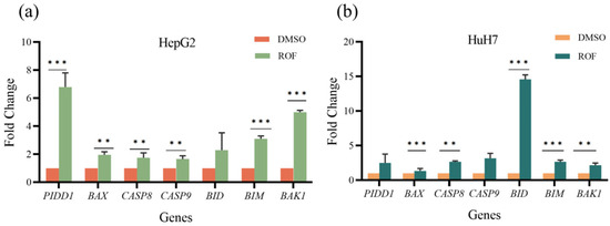 Further, caspase family proteins (CASP8/9) manifested considerable expression in response to ROF treatment, with a 1.75- and 1.66-fold increase observed in HepG2 cells and a 2.65- and 3.15-fold increase in HuH7 cells, respectively. The protein expressions of BID, BIM, BAX, CASP8, and BAK1, which promote apoptosis, were all increased in response to ROF treatment (Figure 6a,b).