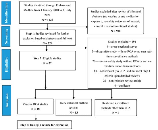 Out of the 1128 articles that were identified and screened, 228 articles were eligible for a full-text review based on the review of titles and abstracts in Step 1 (Figure 1). Of the 228 articles, 37 were considered eligible after the full-text review in Step 2. The reasons for exclusion in each step are as outlined in Figure 1. Of the 37 eligible articles, 18 [,,,,,,,,,,,,,,,,,] vaccine safety RCA studies were included for in-depth review and data extraction, 13 [,,,,,,,,,,,,] articles described approaches to define and apply RCA methodological characteristics (i.e., articles on RCA statistical methods), and 6 [,,,,,] articles summarized non-RCA near real-time surveillance methods.
