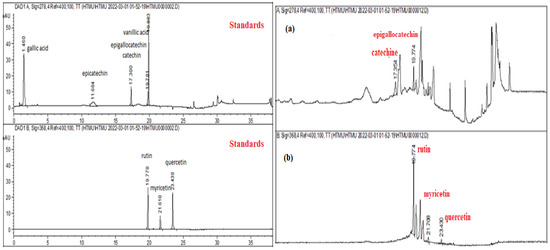 HPLC–DAD chromatograms of the S. nigra extract. The reference standards ((+)-epicatechin gallate, (-)-catechin, (-) epigallocatechin, rutin, quercetin, myricetin, kaempferol, gallic, and vanillic acids) and HPLC chromatogram, where (a) catechin/epigallocatechin and (b) rutin, myricetin, and quercetin.