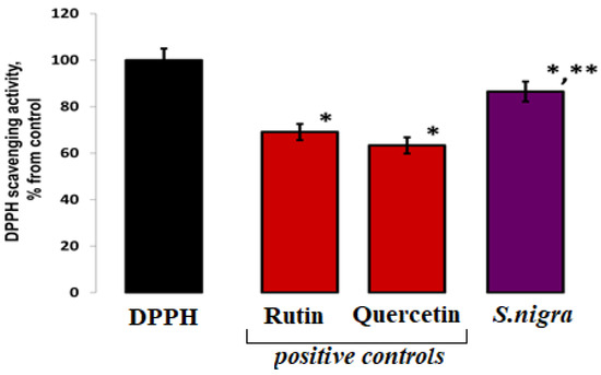 DPPH (80 µM) radical scavenging capacities of S. nigra-lyophilized extract and positive controls—rutin and quercetin. DPPH-H/R generation started immediately at 23 °C, and the EPR processing was performed using WIN-EPR SimFonia 1.2/6130860 software. One-way ANOVA with Student’s t-test was used to determine statistically significant differences, at p < 0.002, between groups. The results were present in arbitrary units and recalculated as µg/DPPH radicals possible to be neutralized by 1 mL extract; * vs. DPPH; ** vs. 782.60 ppm rutin.
