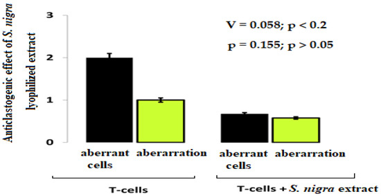 The cytoprotective effect of S. nigra-lyophilized extract tracked against aberrant cells and aberrations. Lymphocyte cultures were prepared from peripheral vein blood in heparin of healthy, nonsmoking, non-drinking (female), and drug-free donors after signing written informed consent forms. The aberrance and aberrant cell degrees were processed by one-way ANOVA followed by χ2-Cramer’s V test (GraphPadPrism 6/Windows; GraphPad Software, Inc., San Diego, CA, USA). Data are presented as mean ± SD; p < 0.05 was considered statistically significant.