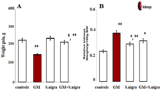 Body weight increment (BW, (A)) and relative kidney weight (KW, (B)) were measured on the 10th day of this experiment; controls (standard diet), GM only, S. nigra only, GM + S. nigra combined therapy. The quantitative data were expressed as the means ± SD (n = 6). * p < 0.001 vs. controls; ** p < 0.05 vs. GM group.