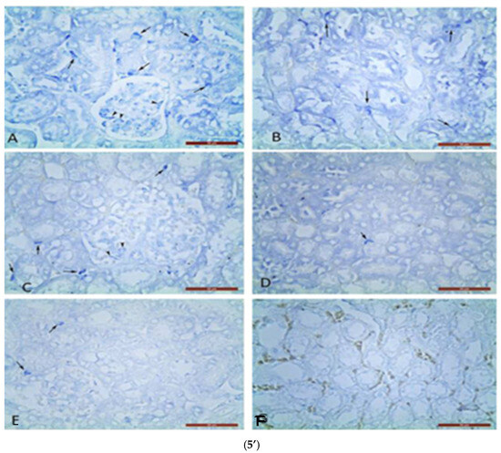 Metachromatic MC localization was found in the renal corpuscles and between the proximal and distal convoluted tubules on nephron in the renal cortex. Single MCs were estimated in glomeruli and between nephron tubules in controls (Figure 5’).