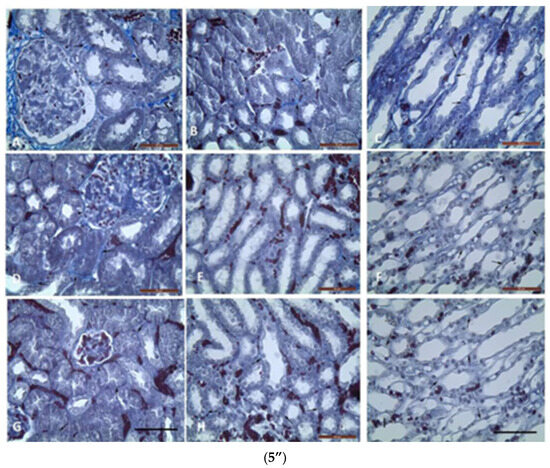 Metachromatic mast cells (5’) in renal cortex (5’A,5’C,5’E) and upper medulla (5’B,5’D,5’F): (5’A,5’B) in GM treated mice; (5’C,5’D) in GM + S. nigra mice; ((5’E,5’F)-MCs absence) in controls. Arrows—MCs between nephron tubules; arrowheads—MCs in glomerulus (Bar × 50 µm). Kidney’s cortex (5”) (5”A,5”D,5”G) and upper (5”B,5”E,5”H) and inner (5”C,5”F,5”I) medulla sections obtained from mice and stained by Azan technique. Groups: (5”A,5”B,5”C) mice with GM-induced fibrosis and intensive blue staining and large collagen deposition (collagen fibers and bundles); (5”B) GM-treated group and subsequent treatment with S. nigra—thinner collagen fibers are present than in GM group; (5”C) controls with delicate (thinnest) collagen fibers comparing to GM only and GM + S. nigra therapy (Bar × 200 µm). Arrows—collagen fibers and bundles between nephron tubules; arrowheads—collagen fibers and bundles around renal corpuscle capsule. The data were processed by one-way ANOVA followed by Tukey Kramer’s test (GraphPadPrism 6 for Windows; GraphPad Software, Inc., USA), as mean ± SD; p < 0.05 was considered statistically significant.
