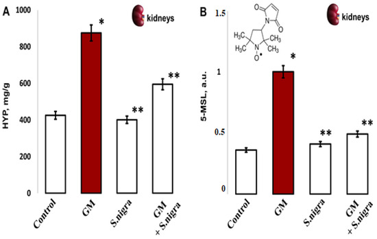 The S. nigra extract effects on GM-induced nephrotoxicity and oxidative changes in (A) renal hydroxyproline content (mg/g) and (B) protein oxidation levels by 5-MSL spin–adduct formations, expressed in arbitrary units (a.u.) after tree independent EPR measurements. The results are presented as mean ± SD (n = 6). One-way ANOVA with Student’s t-test was used to determine significant differences in relation to (*) p < 0.05 vs. controls and (**) p < 0.005 vs. GM-treated mice.