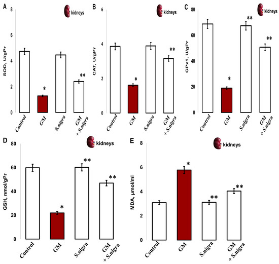Conversely, the S. nigra co-administration at 120 mg kg−1 showed significant GM inhibition and substantial incensement in the enzymatic defense by OS amelioration in kidneys. Markedly, induced activities of SOD (1.291 ± 0.35 vs. 3.81 ± 0.41 IU/gHb, p < 0.05), CAT (1.62 ± 0.13 vs. 3.17 ± 0, 19 IU/gPr, p < 0.05), GPx1 (18.99 ± 2.86 vs. 50.75 ± 3.39 IU/gPr, p < 0.05), GSH (21.99 ± 3.22 vs. 46.97 ± 5.39, p < 0.001), and MDA (5.87 ± 0.9 vs. 4.041 ± 0.12 µmol/mL, p < 0.05) were registered vs. controls (Figure 8A–D).