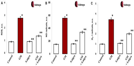 The S. nigra extract effects on GM-induced nephrotoxicity and oxidative changes in (A) ROS production, (B) nitric radicals (NO•), and (C) superoxide anion radical (•O2-). The radicals were scavenged in triplicate by EPR spectroscopy using Win-EPR and Sim-Fonia software and expressed in arbitrary units (a.u.). The results are presented as mean ± SD (n = 6). One-way ANOVA with Student’s t-test was used to determine statistically significant differences in relation to * p < 0.05 vs. controls and ** p < 0.005 vs. GM-treated mice.