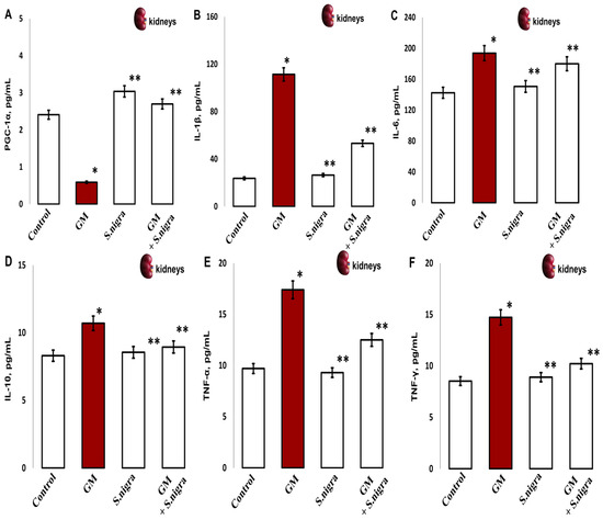 The S. nigra extract effects on GM-induced nephrotoxicity and pro-inflammatory changes in (A) PGC-1 (pg mL−1), (B) IL-1β (pg mL−1), (C) IL-6 (pg mL−1), (D) IL-10 (pg mL−1), (E) TNF-α (pg mL−1), and (F) IFN-γ (pg mL−1). The results are presented as mean ± SD (n = 6). One-way ANOVA with Student’s t-test was used to determine statistically significant differences in relation to (*) p < 0.05 vs. controls and (**) p < 0.001 vs. GM-treated mice.