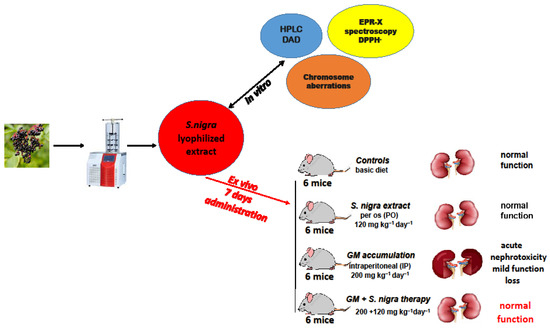 Therefore, we investigated the cytoprotective and antioxidant therapeutic effects of a lyophilized S. nigra fruit extract on GM-induced nephrotoxicity in a 7-day experimental rodent model. Furthermore, we focused on the possible oxidative mechanisms of action of S. nigra-lyophilized extract against acute renal toxicity. We suggest that the ameliorating effect of the lyophilized extract of S. nigra is focused on protective action and direct regulation of ROS, NO• and •O2− concentrations, redox–homeostatic albumin imbalance, and anti-inflammatory activity in acute GM-nephrotoxicity.