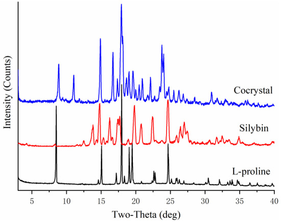 PXRD patterns of Silybin, L-proline, and their cocrystal.