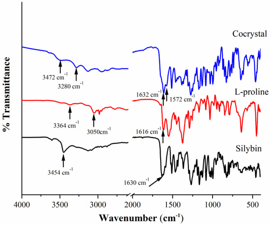 FTIR spectra of Silybin, L-proline, and their cocrystal.
