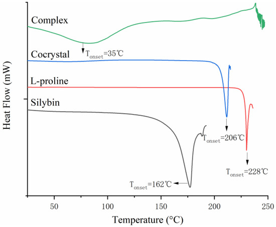 DSC profiles of Silybin, L-proline, Silybin complex, and their cocrystal.