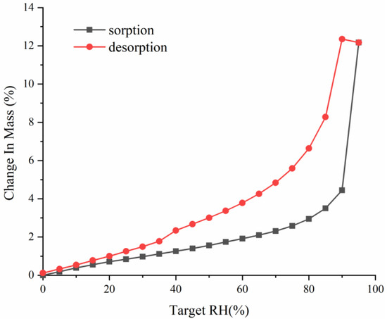 The hygroscopicity behaviors of the materials were studied on an Intrinsic DVS instrument from Surface Measurement Systems, Ltd. (Wembley, UK). The samples were mounted on a balance and studied over a humidity range from 0 to 95% RH at 25 °C. Each humidity step was conducted if less than a 0.02% weight change occurred within 10 min.