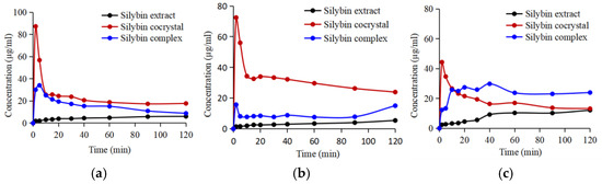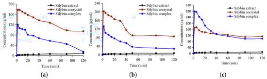 Dissolution profiles of Silybin (black line), Silybin complex (blue line), and Silybin cocrystal (red line) in buffer solutions with (a) pH of 2.0, (b) pH of 4.5, and (c) pH of 6.8.