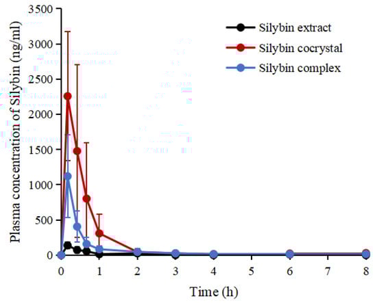 Plasma concentration–time curves of raw Silybin, phosphatidylcholine complex of Silybin, and Silybin cocrystal (data are expressed as mean ± SD, n = 6).