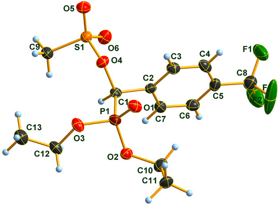 The molecular and crystal structures of only three more or less analogous compounds (AC) [21,22,23] have been described in the literature (Figure 2). Compound B [22] is the best for comparison purposes. The structures of sulfonyloxyphosphonates 8e and B, in fact, fit well with each other.