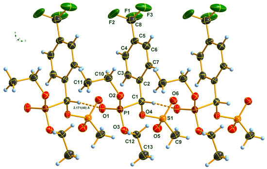 In the crystal structure of phosphonate 8e, non-classical hydrogen bonds between the hydrogen atom at C1 and oxygen atom at phosphorus O1 result in the formation of chains along the b–axis (Figure 3). The structural parameters of the hydrogen bonds are: D–H: 0.99(4) Å, A···H: 2.17(4) Å, D···A: 3.157(5) Å, D–H···A: 170.6(30)°. Remarkably, the oxygen atoms at sulfur do not participate in significant hydrogen bonding interactions.