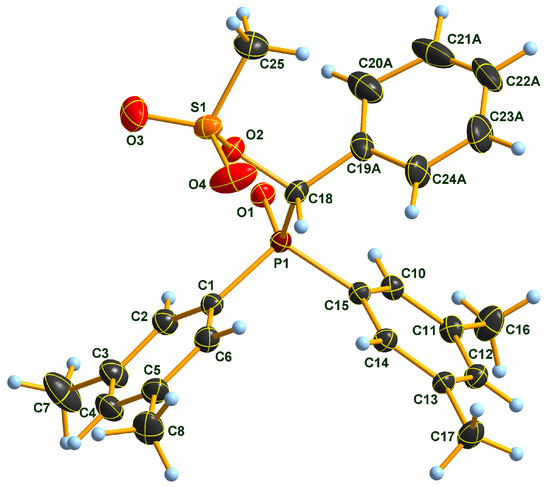 Sulfonyloxyphosphine oxide 11 crystallizes in the orthorhombic space group Pna21 with four formula units in the unit cell. The asymmetric unit comprises one molecule of 11. The molecular structure is shown in Figure 4. The phenyl ring bonded to C18 is disordered over two positions. Only one of these positions is shown for clarity. All atom distances and bond angles are in the expected range. The also molecule adopts in this case a staggered conformation along the P-C bond to C18 in order to minimize steric repulsion.