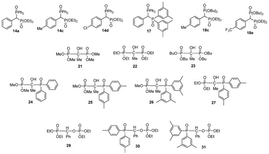 Bisphosphonic products coming from the Michaelis–Arbuzov reaction 14a, 14c, 14d, 17, 18c and 18e, along with hydroxy-methylenebisphosphonic derivatives (2127) obtained in the Pudovik reaction, as well as related rearranged species 29, 30 and 31, were subjected to a bioactivity study (Figure 7).