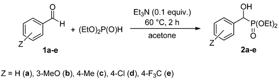 The starting α-hydroxyphosphonates (2ae) were prepared by the method developed in our research group earlier [18]. The mixture of substituted benzaldehyde (1ae) and a stochiometric amount of diethyl phosphite was refluxed in the presence of 0.1 equiv. of triethylamine for 2 h in acetone as the solvent, then n-pentane was added, and the mixture cooled to 5 °C, whereupon α-hydroxy-benzylphosphonates 2a and 2ce crystallized out. The crystals were filtered off and washed with pentane. Product 2b was obtained as an oil, and it was purified by column chromatography (Scheme 2).