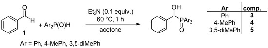 The procedure described above was extended to the synthesis of α-hydroxy-benzylphosphine oxides (35). In this case, 1 h of reflux was sufficient. Diaryl α-hydroxy-benzylphosphine oxides 35 were obtained as white crystalline products (Scheme 3).