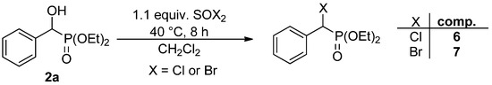The α-halogenophosphonates were prepared by the method described by Keglevich and Grün et al. [19] earlier. Diethyl α-hydroxy-benzylphosphonate 2a was reacted with 1.1 equiv. of thionyl chloride or thionyl bromide at 40 °C in dichloromethane for 8 h. After purification by chromatography, the expected α-chloro-benzylphosphonate 6 and α-bromo-benzylphosphonate 7 were isolated in 81/83% yields, and they were identified by 31P NMR shifts, as well as HPLC-MS (Scheme 4).