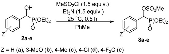 α-Hydroxy-benzylphosphonates 2ae were reacted with 1.5 equiv. of methanesulfonyl chloride at 25 °C in the presence of 1.5 equiv. of triethylamine in toluene for 0.5 h to afford products 8ae in 76–84% yields after purification by chromatography (Scheme 5). The mesyloxyphosphonates 8ad were described by us earlier [17] and were then identified by δP their shifts and HPLC. Diethyl α-methanesulfonyloxy-4-trifluoromethylbenzylphosphonates (8e) is a new compound and was fully characterized.