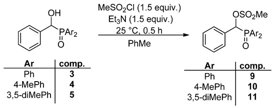 Hydroxy-benzylphosphine oxides 35 were also reacted with methanesulfonyl chloride under similar conditions to afford products 911 in 78–98% yields after purification by chromatography (Scheme 6). Diaryl α-methanesulfonyloxy-benzylphosphine oxides 911 are new compounds, and were fully characterized by 31P, 13C, 1H NMR spectroscopy and HRMS.