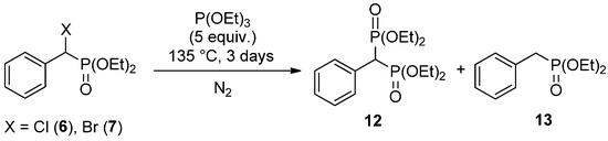 Previously, we observed that the Arbuzov reaction of α-chloro- and even α-bromo-benzylphosphonates (6 and 7) with triethyl phosphite yielded the desired bisphosphonate derivative (12) in only low conversions together with by-products including diethyl benzylphosphonate (13), along with diethyl phosphite and diethyl ethylphosphonate (Scheme 7) [17].